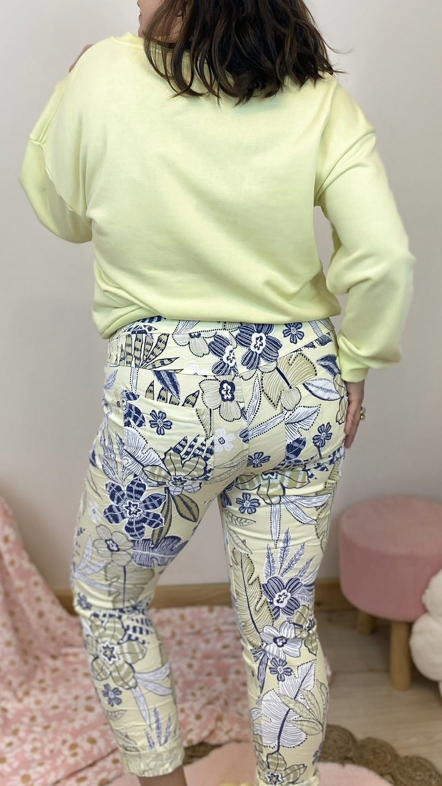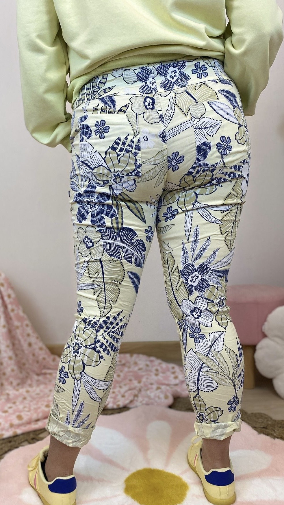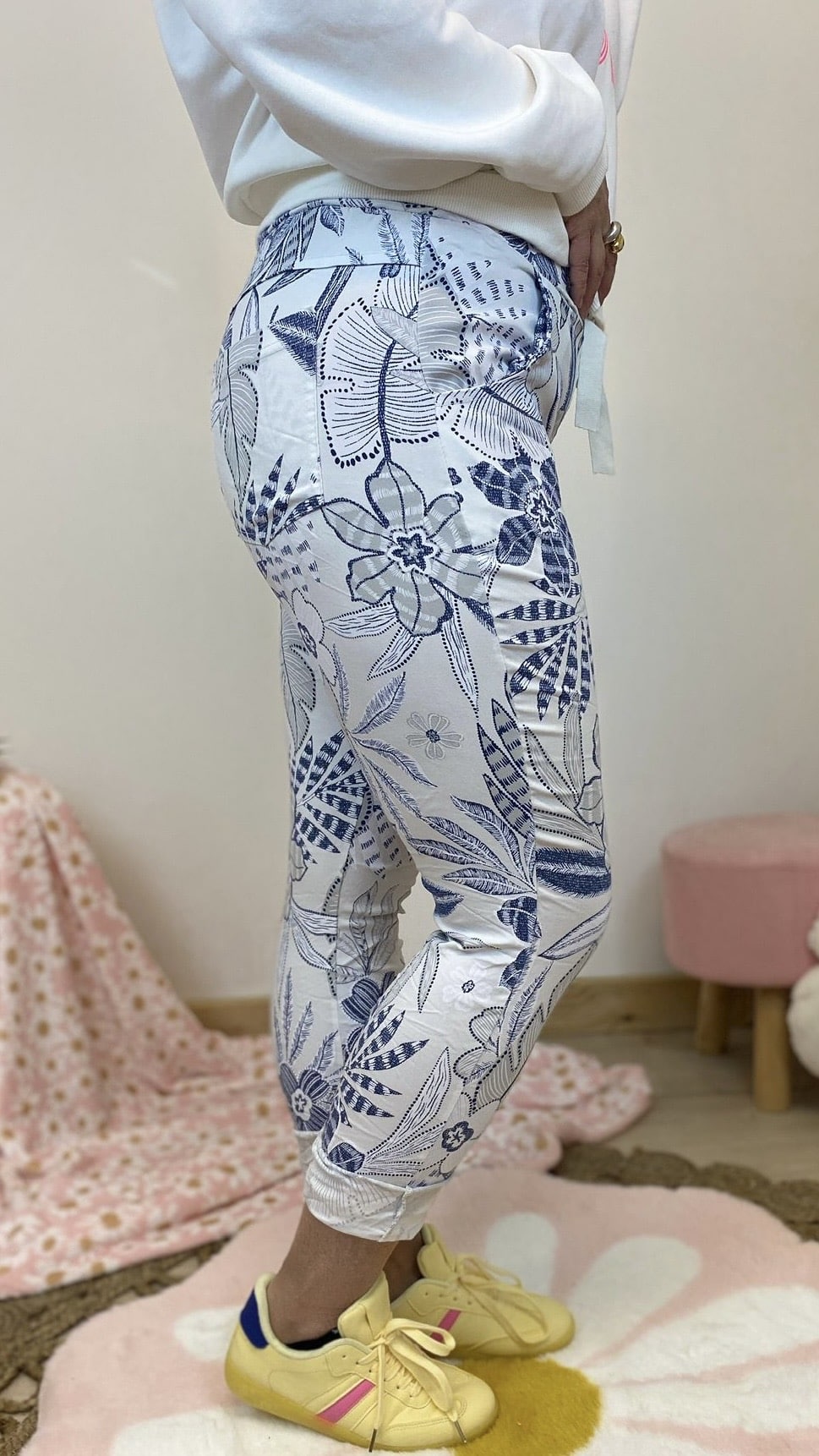 Pantalon confort strech imprimé feuillage (rose,jaune,blanc)